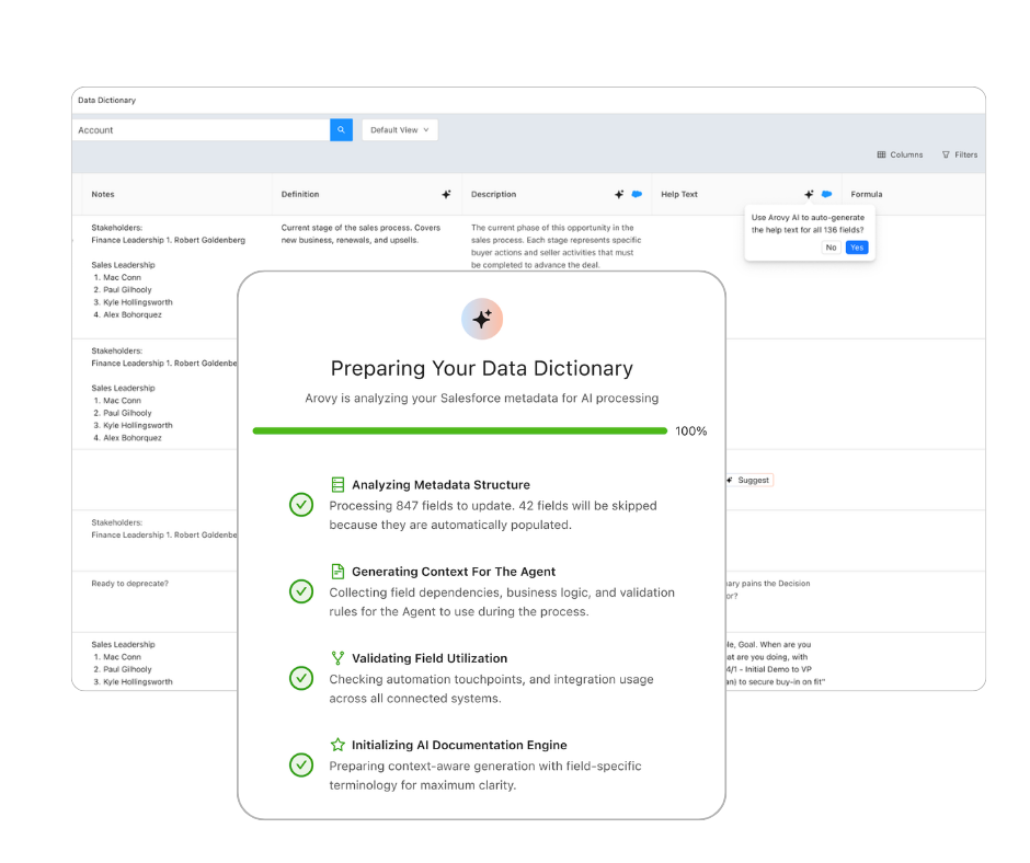 Arovy is the leading Salesforce governance platform, helping organizations move faster with confidence across their analytics, security, and AI initiatives.